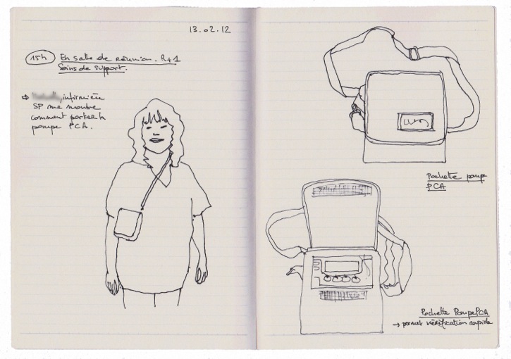 Les images, si elles ne peuvent être détachées de leur contexte (légende, expérimentation, etc.), constituent depuis longtemps des documents de recherche : schémas anatomiques (Pieters, 2010), cartes géographiques ou croquis anthropologiques, sont bel et bien des objets de connaissance issus d’une recherche méthodique. On pourrait donc envisager que la production d’une thèse de design puisse être partiellement ou majoritairement constituée de ce type de documents – clairement articulés par du texte. En cela, le design emprunte à d’autres disciplines. Le travail en anthropologie et design de (Marine Royer (2014) incorpore le dessin comme une manière de transcrire et d’observer (Fig. 1). Lors de ses observations de terrain, ces objets intermédiaires (Jeantet, 1998) ont permis la construction d’un savoir commun. Dans un autre registre, nous pouvons citer pour exemple la thèse d’exercice en médecine de Serge Tisseron (1975), entièrement rédigée sous forme de bande dessinée.