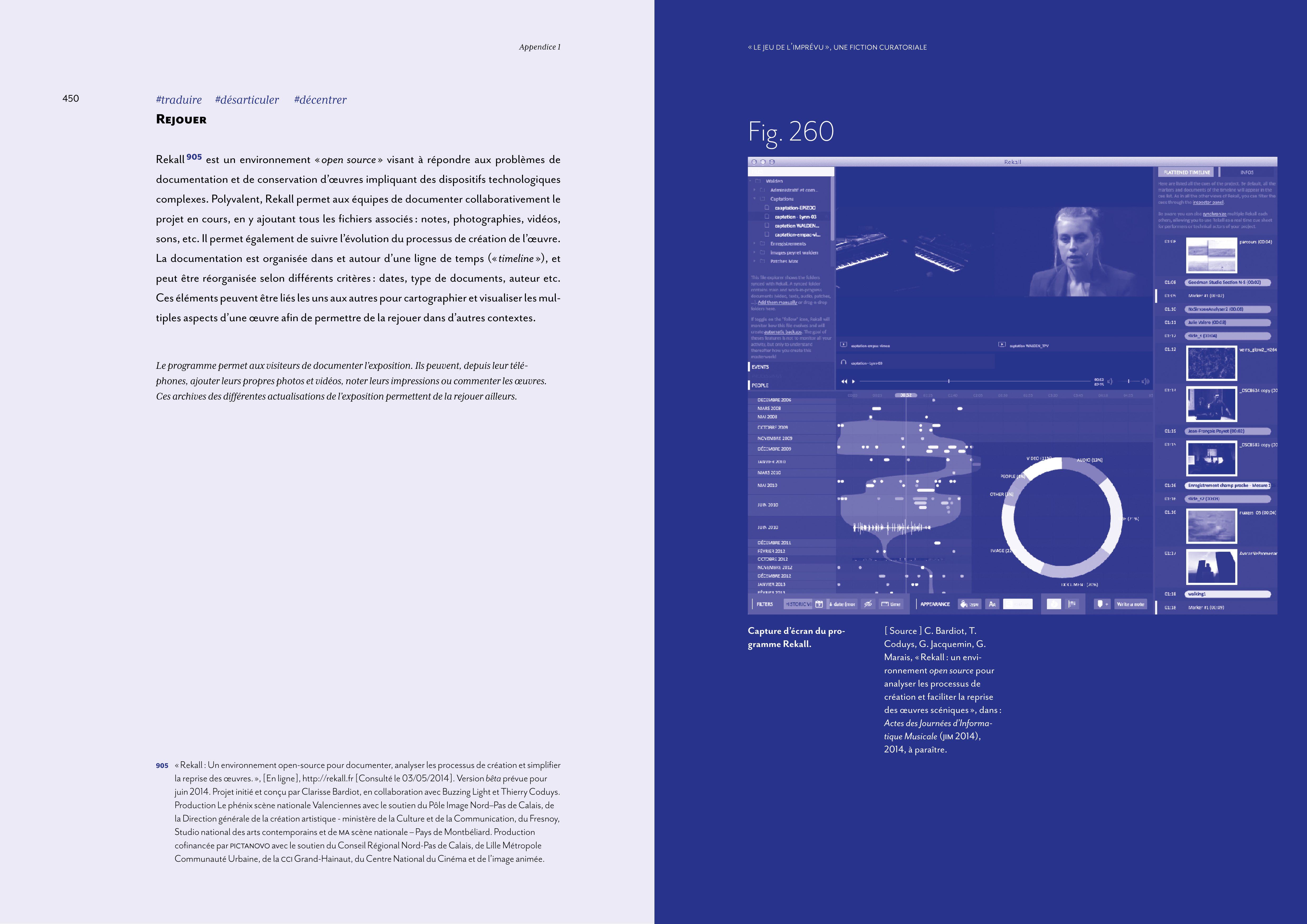 Les supports vidéos et sonores sont couramment utilisés lors du processus de recherche. Ils peuvent constituer un corpus, ou même être cités, mais ils sont rarement incorporés – d’où le recours à des planches d’images de captures d’écrans. Comment expliquer cela, alors qu’il existe des doctorats en musique et cinéma ? Il y a bien sûr des problématiques de transmission et de pérennité plus importantes qu’avec les images ou le texte, mais également des problèmes de droit à la citation dans le cas de vidéo incorporant des extraits de scènes. Il n’existe pas, à notre connaissance, de thèse qui en fasse pleinement usage dans sa forme finale, si ce n’est sous forme de documents consultables en « annexe ». On assiste pourtant à l’émergence de nombreux outils d’annotations 19 Voir Rekall, http://www.rekall.fr ; ou le système de la New York Public Library, https://digitalcollections.nypl.org visant à articuler des documents multimédias à des commentaires pour faire émerger d’autres modes de lectures. Ce type de démarche intéresse particulièrement le design puisque, particulièrement dans le cas de projets portant sur les nouvelles technologies, la vidéo «de démonstration » est plébiscitée 20 Il y a d’abord une certaine idée de « véracité » par l’image, mais aussi toute une série de conséquences pour le public, et notamment une manière de façonner les imaginaires (voir Kirby, 2009). Sur le rôle de la vidéo de démonstration, voir Bean, & Rosner (2013).. On pourrait donc tout à fait concevoir que, dans d’autres sciences descriptives ou de conception, cette forme devienne légitime 21 Les vidéos sont déjà utilisées dans la recherche en Interaction Homme Machine, mais aussi dans certains articles de biologie. Elles font partie du matériel de recherche à produire et à évaluer., tout comme les nombreuses autres formes « interactives ». Notons qu’il existe des projets de recherche qui en font usage, comme 9 evenings, Theatre and Evenings de Clarisse Bardiot 22 Voir en ligne : http://www.fondation-langlois.org/flash/f/index.php?NumPage=571 .