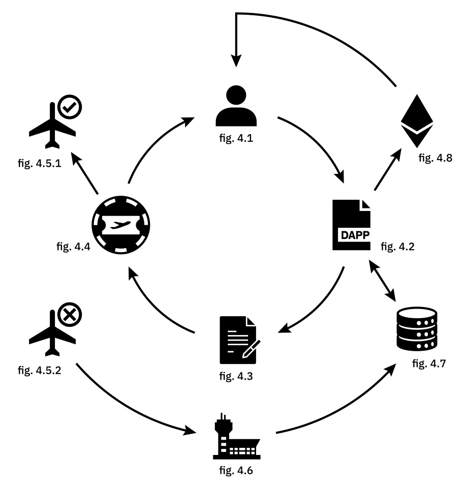 L’utilisateur [Fig. 4.1] va envoyer des ethers à l’application décentralisée (dApp) de la compagnie aérienne [Fig. 4.2] qui va enregistrer la transaction dans un smart-contract [Fig. 4.3] et créer un token-billet [Fig. 4.4]. Ce jeton sera dépensé (détruit) lors de son utilisation [Fig. 4.5.1]. Si le vol est annulé [Fig. 4.5.2] un oracle [Fig. 4.7] connecté au réseau de l’aéroport [Fig. 4.6] déclenchera le smart-contract qui remboursera, au travers de la dApp [Fig. 4.2], l’utilisateur en ethers [Fig. 4.9].
