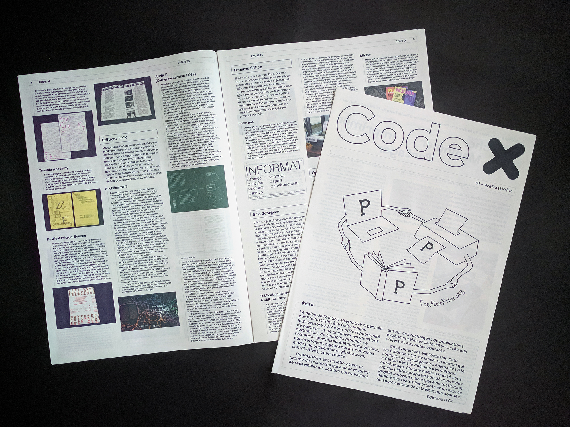 114 Code X, Orléans, Hyx, 2017, http://www.editions-hyx.com/fr/code-x : « Code X est un journal publié à l’occasion du salon de l’édition alternative organisé par PrePostPrint à La Gaîté Lyrique, le 21 octobre 2017. »