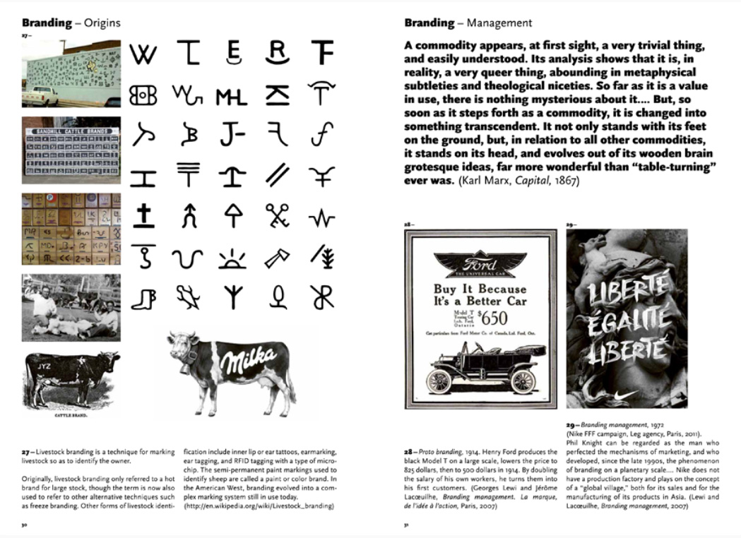 Des expressions comme « management par projets » ou « classement des universités » s’inscrivent dans l’idée d’une mise en concurrence des chercheurs et des établissements, qui deviennent alors comparables à des écuries. Les pratiques des chercheurs doivent s’adapter en conséquence et privilégier des actions en conformité avec les critères de notation (types et langues de publication, etc.). Les cursus sont également concernés : injonctions à la « professionnalisation », « ouverture internationale », etc. – ce qui recoupe et prolonge les critiques énoncées par Norbert Wiener, Martin Heidegger ou Jacques Lacan dès le milieu des années 1950. L’« autonomie » souhaitée par les gouvernements a pour corollaire la transformation des universités en « marques » afin d’attirer le meilleur public possible sur un échiquier désormais mondial. Cette ère du branding (de brand, marquage à chaud des bestiaux) entraîne une confusion entre les secteurs autrefois séparés du public et du privé. Le designer graphique Ruedi Baur livre une critique acerbe de la « misère symbolique » des représentations des collectivités territoriales en se demandant s’il est vraiment souhaitable de traiter la communication des territoires de la même manière que des marques de chaussures ou de boissons : « La question qui nous occupe est donc de savoir si les modèles d’identification basés sur des entreprises commerciales peuvent correspondre aux besoins de lisibilité de nos espaces démocratiques 58 Ruedi Baur, Sébastien Thiéry (dir.), Face au brand territorial. Sur la misère symbolique des systèmes de représentation des collectivités territoriales, Zurich, Lars Müller, 2013, p. 75.. » Ce marquage territorial n’est que le signe d’un processus plus large :