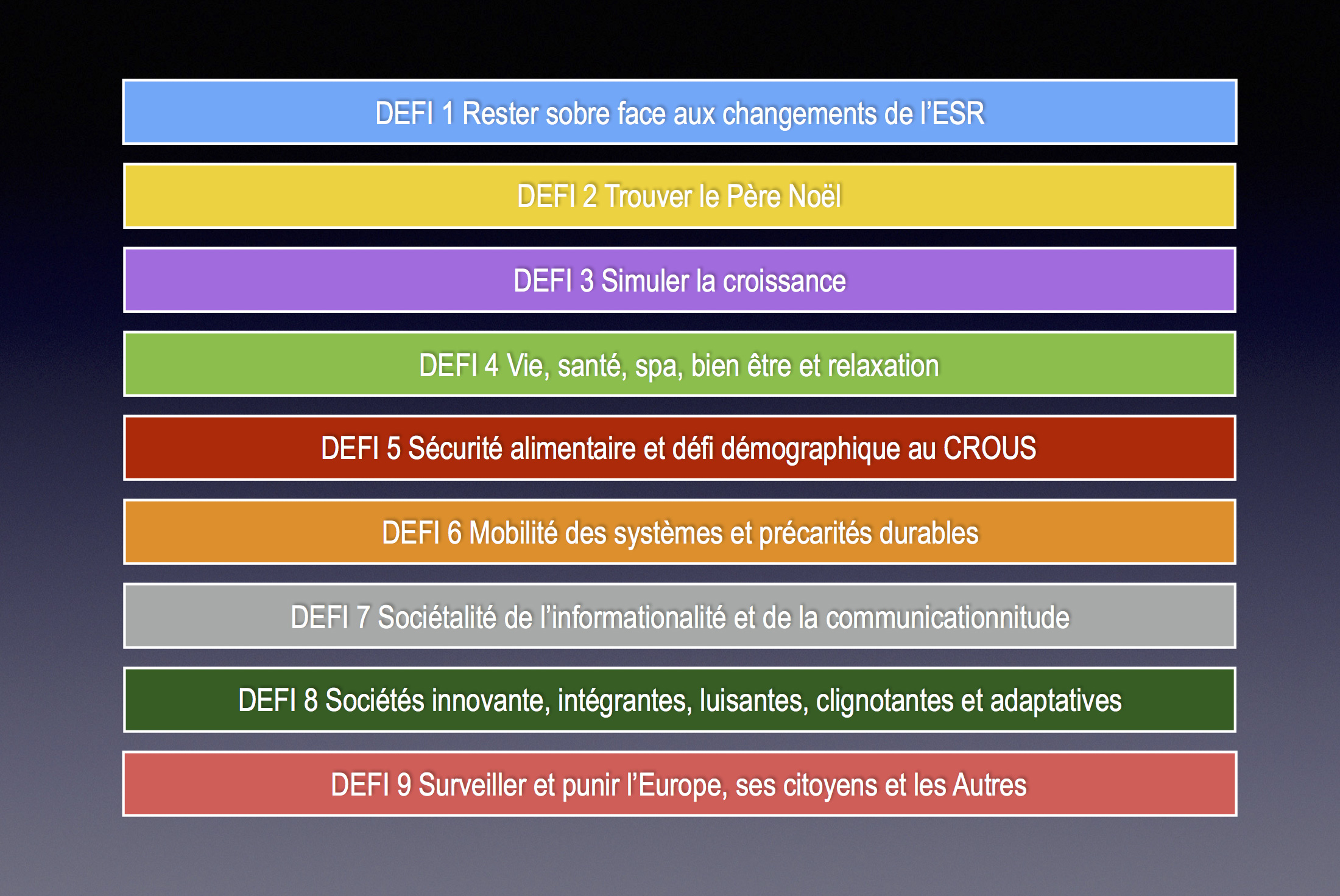 Figure 9 - ANES, « Plan d’action 2017 » : « Les 9 défis sociétiques visent à encourager des recherches thématiques pluri-, multi-, inter- ,trans-, intra-, infra-, exo-, para- ou proto-disciplinaires et désintégrantes autour de grandes questions sociétiques-et-tac. » Source : http://excellagence.fr/plan-daction-2017/