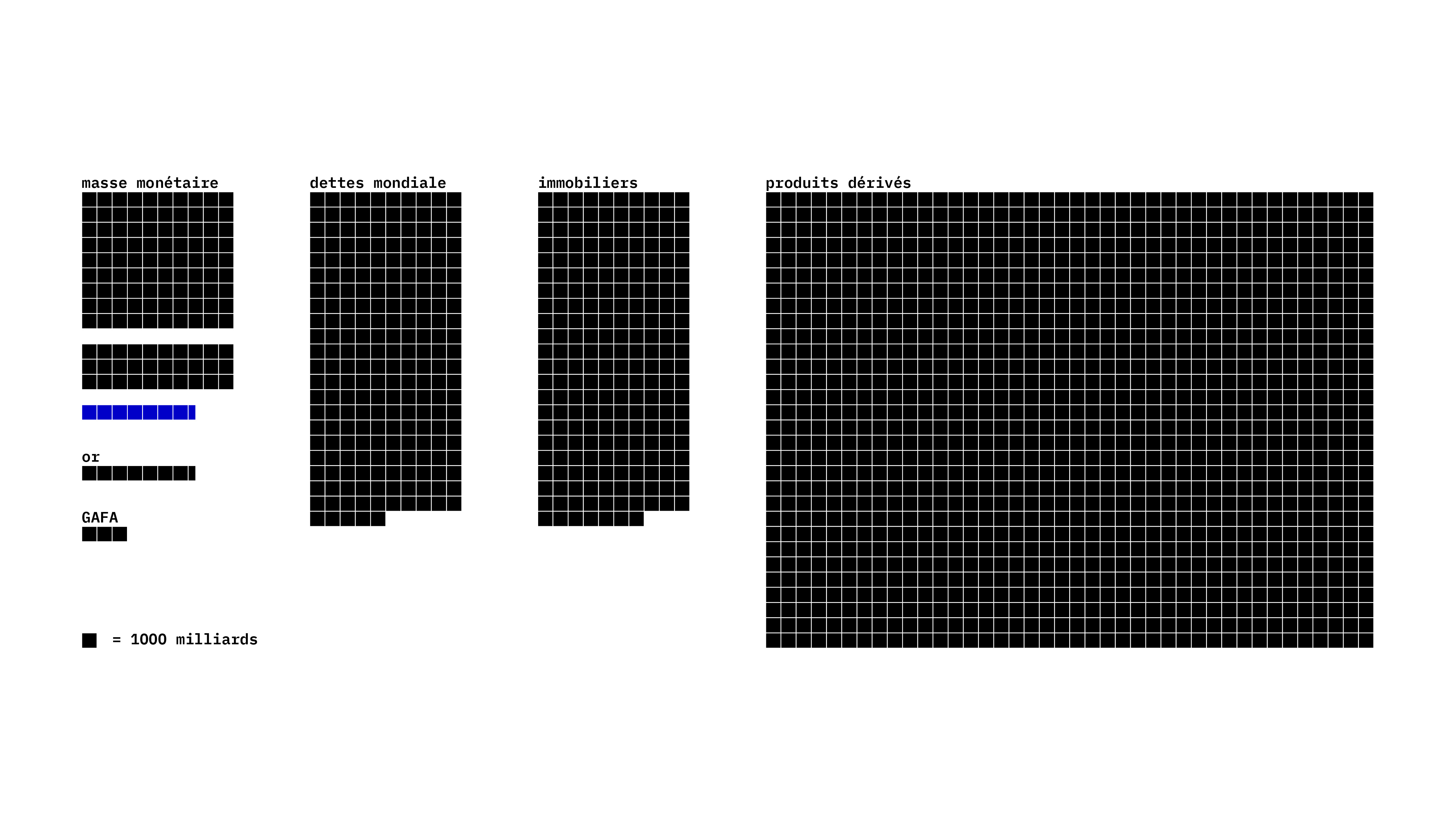 Le trading haute fréquence n’est qu’une des strates de l’informatisation de la finance, dont la voracité sans limite engendra la « crise » des subprimes de 2007 et les faillites bancaires de 2008. En apparence exogènes au champ de la recherche, ces évènements ont pourtant des conséquences très concrètes pour les chercheurs, à qui l’on sape année après année des moyens sous couvert de raisons budgétaires. La situation contemporaine est marquée par l’absurdité du vocabulaire de la « dette », où les citoyens sont sommés de contribuer à son remboursement. Or cette tâche est impossible. En effet, la dette mondiale n’est pas remboursable puisqu’elle dépasse l’ensemble des capitaux humains : alors que la dette mondiale a atteint un niveau record de 233 trillions (233 000 milliards) de dollars au troisième trimestre de 2017, cela représente, une fois rapporté à l’échelle des 7,6 milliards d’habitants de la planète, plus de 30 000 dollars par individu 31 Enda Curran, « Global Debt Hits Record $233 Trillion », Bloomberg, 5 janvier 2018, https://www.bloomberg.com/news/articles/2018-01-05/global-debt-hits-record-233-trillion-but-debt-to-gdp-is-falling. Le design d’information peut aider à comprendre cette incongruité. Le site Web The Money Project 32 Jeff Desjardins, « All of the World’s Money and Markets in One Visualization », The Money Project, 26 octobre 2017, http://money.visualcapitalist.com/worlds-money-markets-one-visualization-2017 propose ainsi un schéma comparatif des différentes valeurs financières à échelle mondiale : métaux précieux, crypto-actifs, capitalisation des GAFAM 33 Google Amazon, Facebook, Apple, Microsoft., fortune des cinquante personnes les plus riches, État de Californie, réserve fédérale américaine, stock market (marchés boursiers), devises tangibles, etc. Toujours dans ce schéma, le bloc de la dette mondiale, de par sa taille, montre clairement que ce dernier n’est pas remboursable – et ce d’autant plus qu’il a augmenté d’un tiers ces dix dernières années. On constate également que les derivatives 34 Voir : « Dériver la finance », dossier dirigé par Yves Citton, Multitudes, no 71, été 2018.. (« produits dérivés »), en grande partie responsables des krachs boursiers, « pèsent » bien davantage que l’ensemble des bourses mondiales ou que l’ensemble des devises tangibles ou intangibles (on estime qu’en France moins de 8% de la monnaie est accessible sous forme physique).
