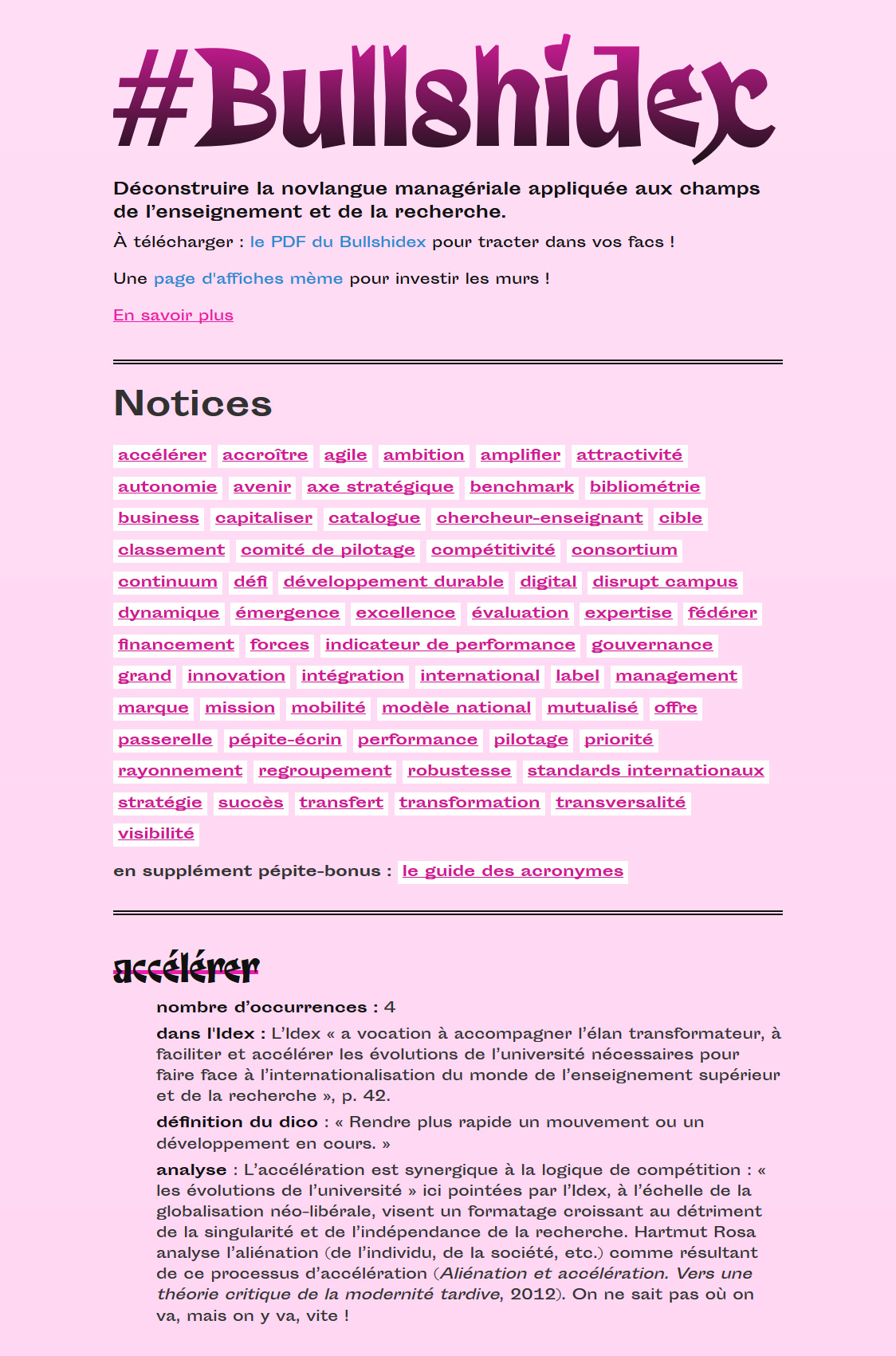 Initié dans un contexte de grève (semaine de « création-contestation 64 « Atelier création-contestation », mars-avril 2018, https://ateliercreationcontestation.github.io/ateliers ») par les enseignants-chercheurs Anthony Masure et Saul Pandelakis, maîtres de conférence en design, un lexique collaboratif fut élaboré 65 Auteurs (liste non exhaustive) : Jonathan Brouillon-Chevalier (étudiant en L2 Design), Charlotte Dourrieu (étudiante en L2 Design), Anthony Masure (maître de conférences en design), Anna Pavie (étudiante en L2 Design), Saul Pandelakis (maître de conférences en design), Rhinocéros Anonyme, Sabÿn Soulard (PRAG en arts plastiques).. en mars 2018. Intitulé #Bullshidex 66 #Bullshidex, mars 2018, https://ateliercreationcontestation.github.io/dico (bullshit index), ce dictionnaire en ligne du bullshit (du baratin) propose une série d’entrées lexicales extraites du projet de réforme Idex – expressions qui se retrouvent dans bien d’autres contextes :