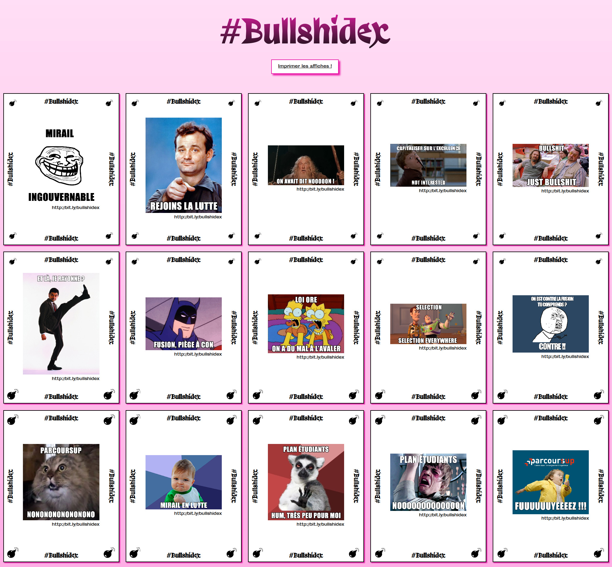 Figure 8.2 - #Bullshidex, générateur d’affiches imprimables utilisant les technologies du CSS Print, conception par Anthony Masure, mars 2018. Source : https://ateliercreationcontestation.github.io/affiches/affiches.html