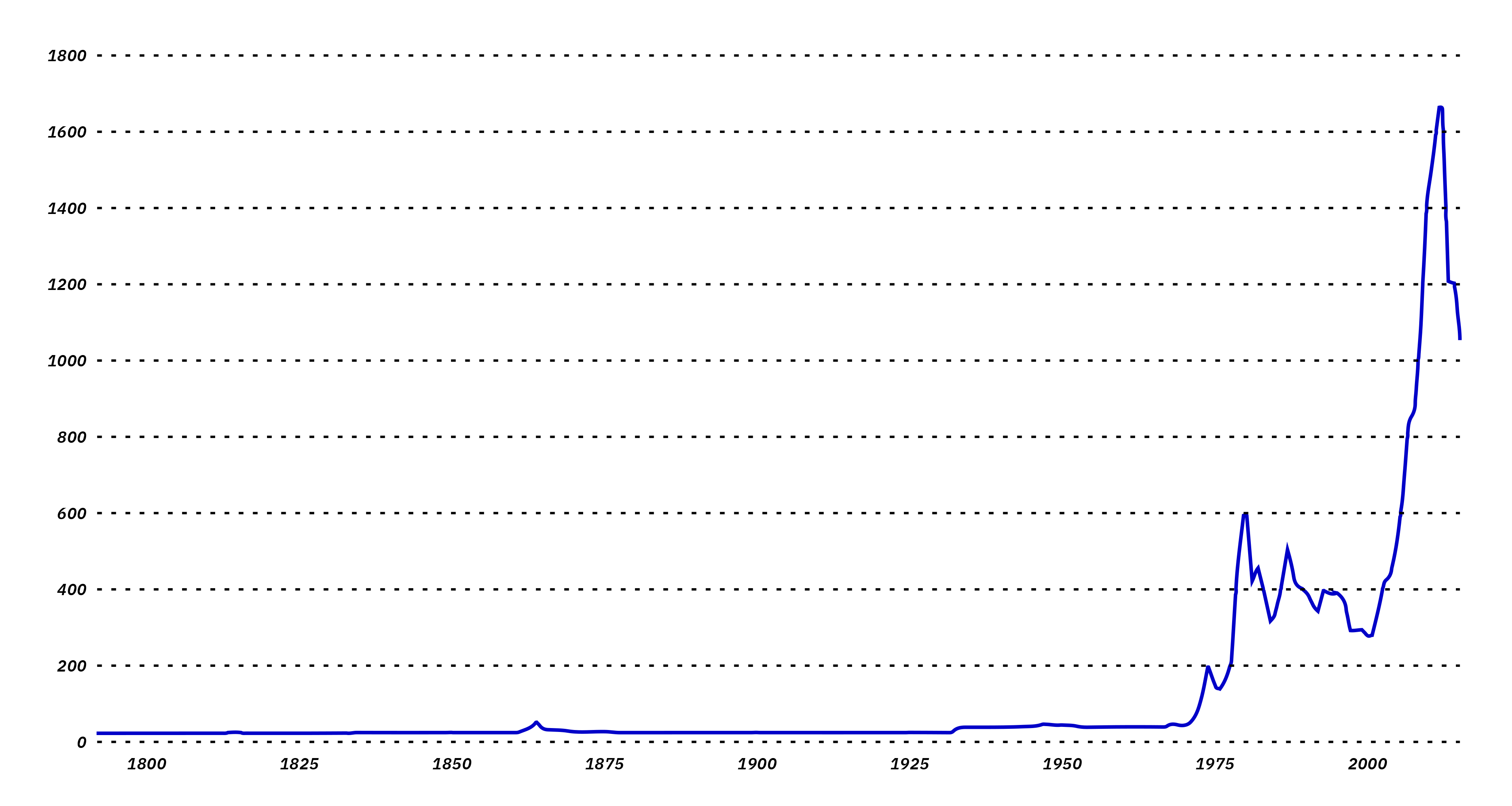 Figure 3 - En perdant sa parité avec l’or la valeur du dollar ne repose plus que sur la confiance qu’ont ses utilisateurs envers l’économie qui la sous-tend. Ce graphique montre l’évolution de la valeur en dollars pour une once d’or. La fin des accords de Bretton Woods met fin à 175 ans de stabilité – la valeur du dollar adoptant désormais le régime de « changes flottants ». Cette date marque le début des déréglements financiers, jusqu’à la crise des subprimes de 2008. Source : Guillaume Helleu, « Vires in numeris. Bloc, bloc, qui voilà ? », conférence donnée à l’occasion du cycle de rencontres « New Kids on the Blockchain », dir. Marie Lechner, Anthony Masure et Clémence Seurat, Paris, Gaité Lyrique, novembre 2018, http://blockchainkids.xyz