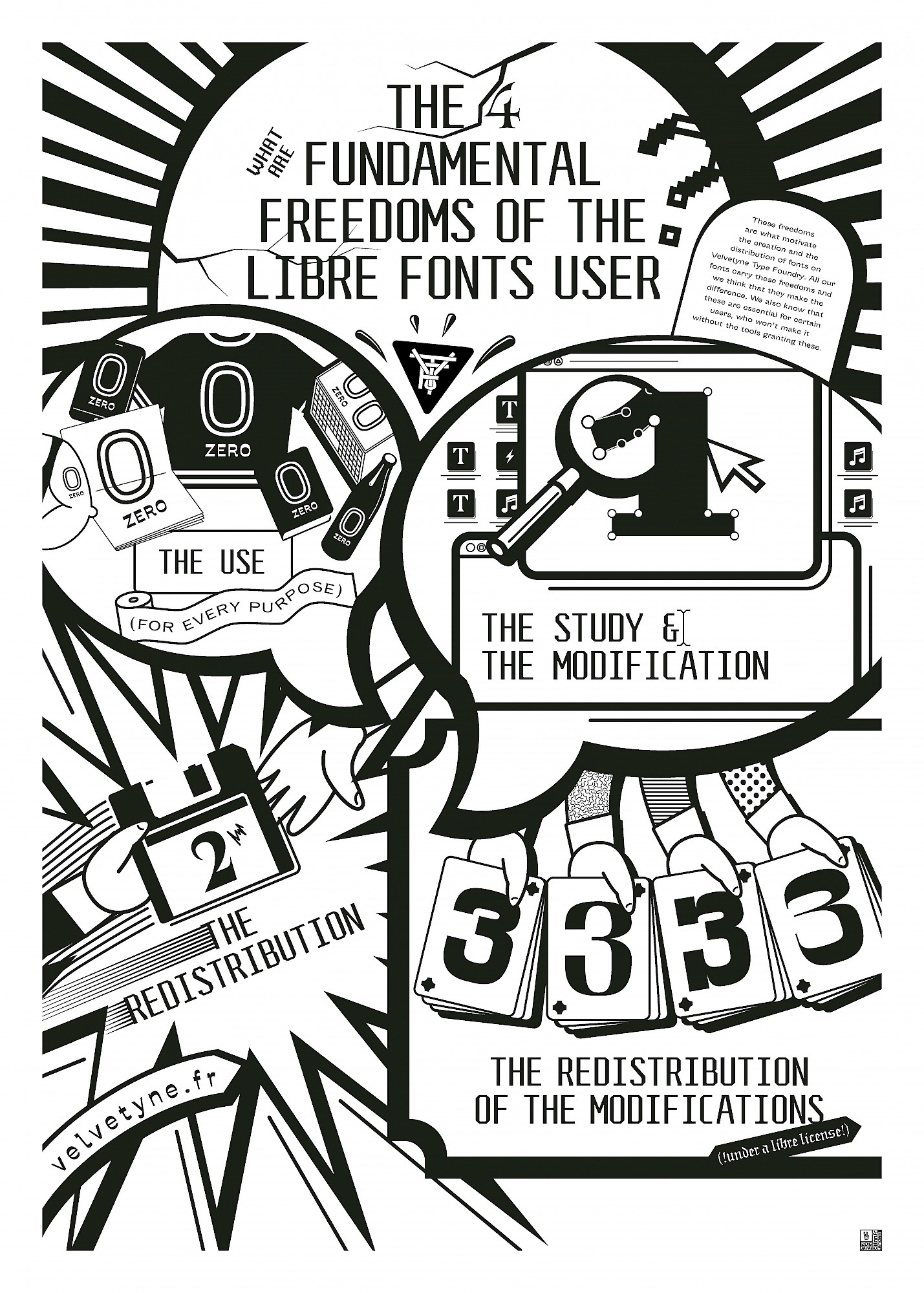 Figure 2 - Illustration des 4 libertés du logiciel libre. Poster conçu par le designer graphique Jérémy Landes-Nones pour la fonderie de caractères Velvetyne, 2016. Source : https://www.velvetyne.fr/about