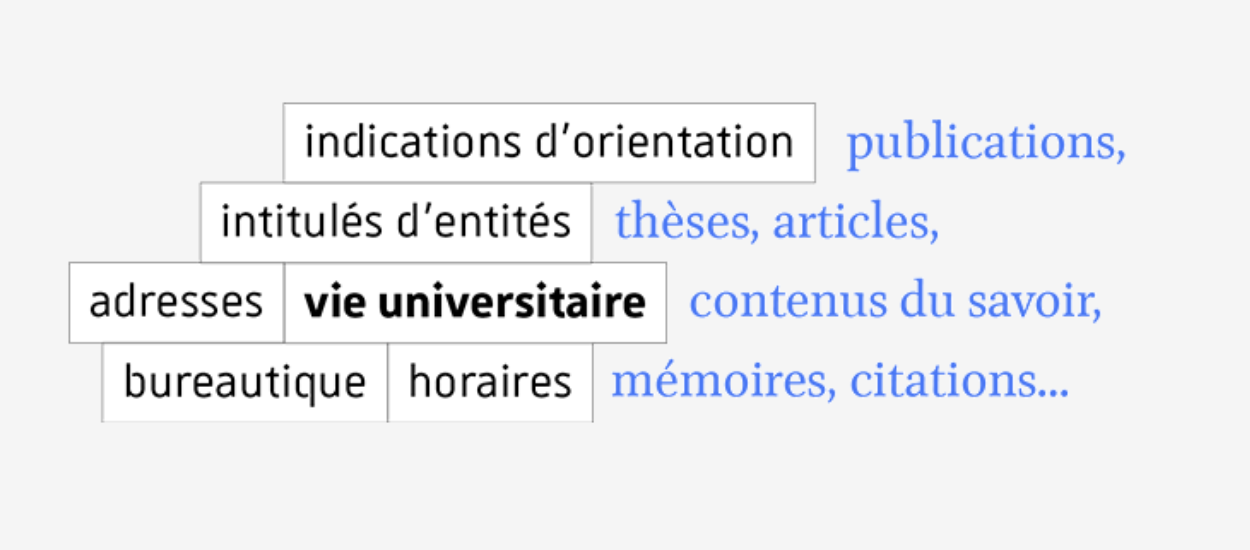 Figure 7.1 - Extrait du « langage visuel » de l’université de Strasbourg, 2016 : « La police de caractères Unistra a été créée sur-mesure pour l’Université de Strasbourg par Christina Poth. À la fois identifiante et contemporaine, elle ancre les contenus de la vie pratique dans un contexte local et singulier. La police de caractères Brill est un caractère académique, sérieux et exhaustif permettant d’écrire les contenus relatifs au savoir. Libre de droits pour un usage non-commercial, elle permet le partage et la libre circulation du savoir. Le système d’identification repose sur l’articulation de deux types de contenus. Les contenus dits de la ‹ vie universitaire › s’écrivent en Unistra et ceux dits du ‹ savoir › en Brill. » Source : http://langagevisuel.unistra.fr