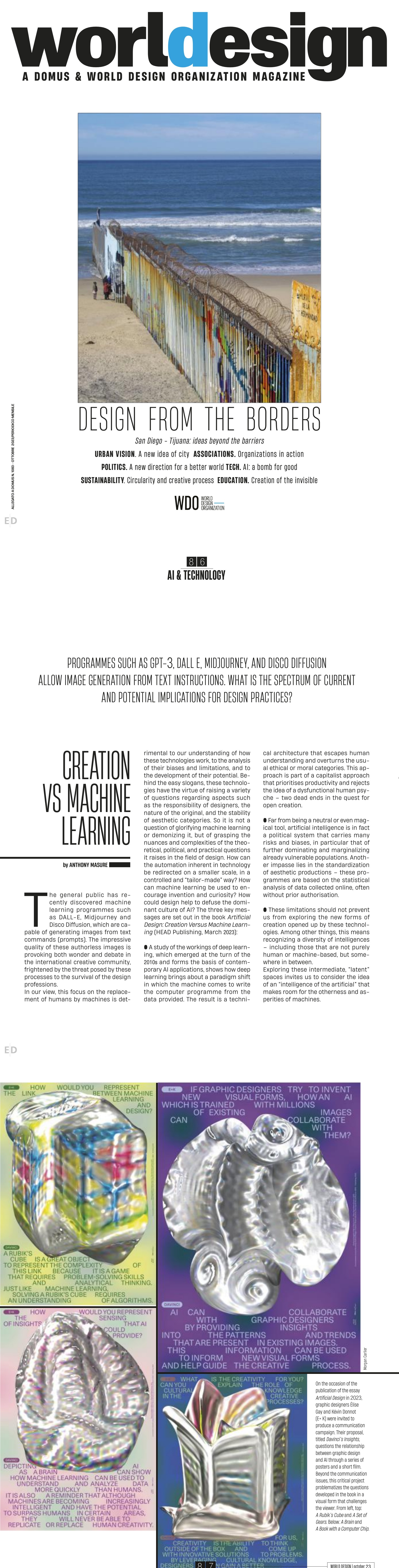 Le grand public a récemment découvert des programmes de machine learning (d’« apprentissage machinique », le courant actuellement dominant de l’intelligence artificielle) comme DALL·E, Midjourney ou Disco Diffusion, capables de générer des images à partir de commandes textuelles (prompts). Ces images sans auteur·trices, d’une qualité impressionnante, suscitent l’émerveillement tout autant que des débats au sein de la communauté créative internationale, qui s’effraie de la menace que ces processus font planer sur la survie des professions du design.