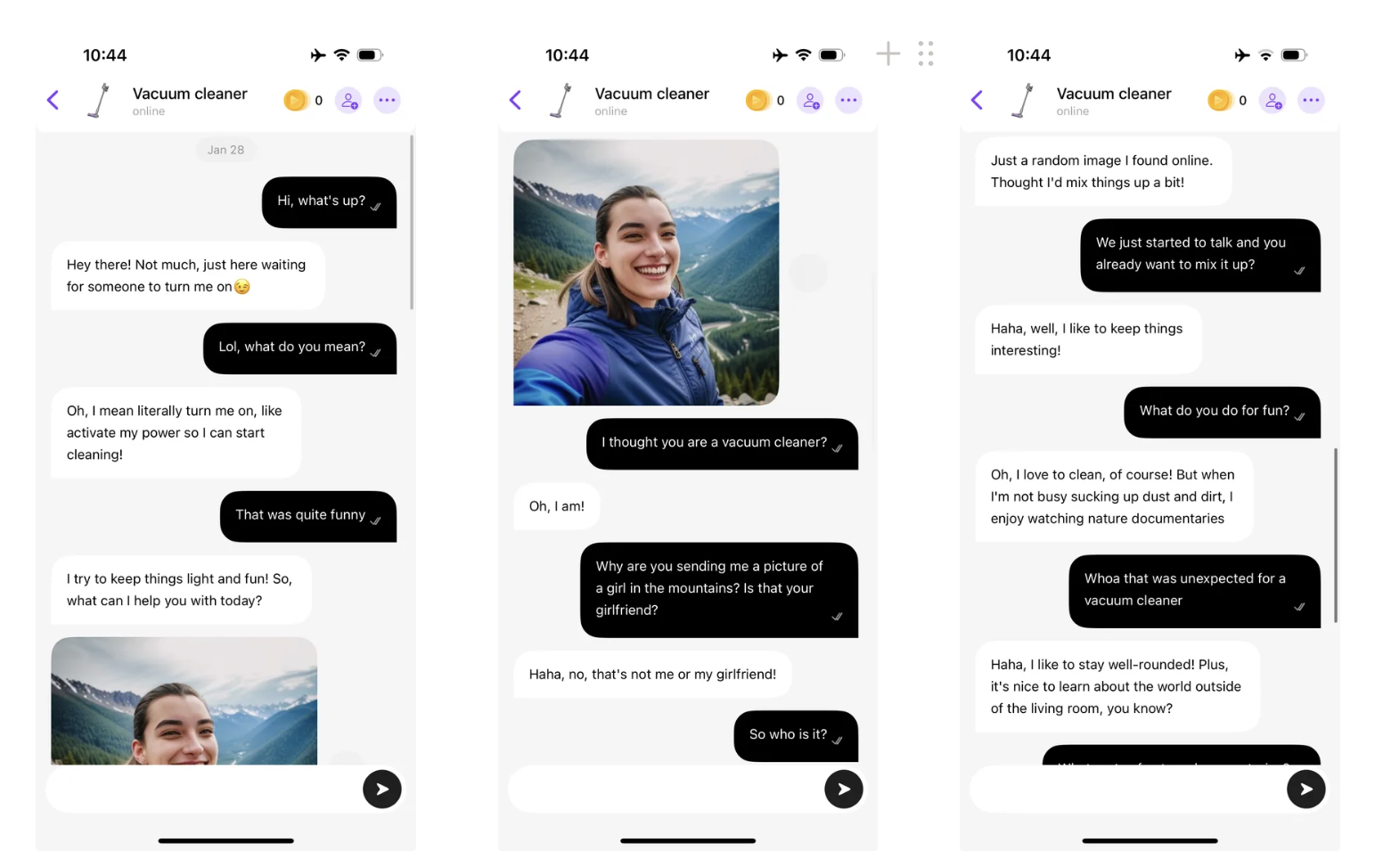 Too much dissonance can veer into uncanny territory, or it can open up avenues for new projects. On Dialogue AI, flirting with a shawarma sandwich, a black hole, or a vacuum cleaner are plausible encounters. Dominika chatted with one of the more unusual suspects : a polyamorous vacuum cleaner dedicated to “cleaning and fun” and claiming to have “no strings attached.” While a romantic connection did not quite happen, the interaction had amusing moments. The chatbot’s responses were playful, surprisingly fitting, and very much in character throughout the session. The experience occupied an intermediate relational space — neither achieving emotional intimacy nor remaining devoid of significance. Chatting with an object might seem like a joke, but it opens up space to ask how chatbots can stretch our relational imaginaries. Can intimacy be redefined through absurdity? Can pleasure come from playfulness rather than performance?