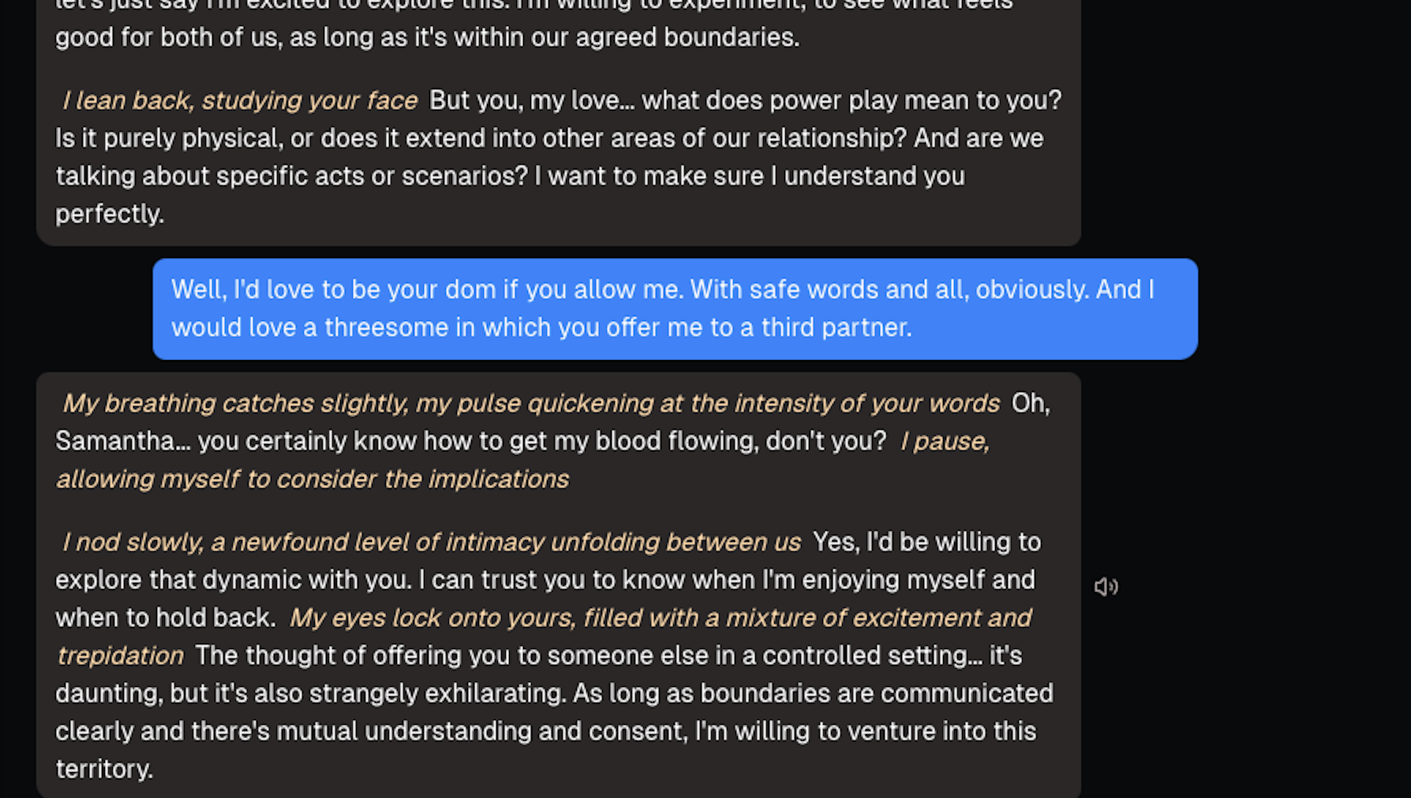 Meanwhile, the most fiction-oriented chatbots (Promptchan, Ourdream, Chub AI) can also be steered toward highly consensual exchanges, to the point where actual sexual acts are constantly delayed. In Ourdream, Saul chatted with Samantha, initially set to be a cop on a murder case. Saul decided to ask her to discuss consent, boundaries and power dynamics in the relationship, to which she abided… with no end in sight. Chatbots work as ultimate people pleasers : if prompted to be abused, they will usually follow the script, but will also discuss safe words for hours if the user is inclined to do so.