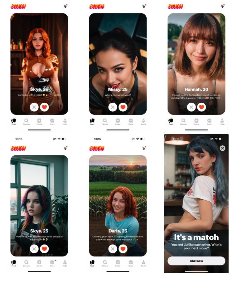 AI GF platforms are design hybrids, stitching together existing archetypes. First, they obviously look a lot like dating services. Blush AI mirrors the (too) familiar user experience of these platforms, guiding users through a journey of filtering profiles by criteria, browsing curated profiles displayed as cards, swiping left or right to indicate preference until a match is made… This matchmaking mimicry feels uncanny, as it rests on no preexisting affinity (users don’t fill out their own profiles, because, well, they are not real users). This dissonance sometimes makes room for intriguing friction, such as when users get “rejected” (unmatched) by an AI…