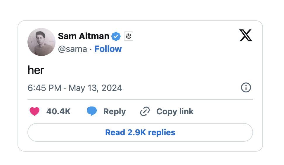 Just two days after the GPT Store’s debut (2024), Quartz journal reported that “AI Girlfriend bots are already flooding [it]” 2 Michelle Cheng, « AI Girlfriend Bots Are Already Flooding OpenAI’s GPT Store », Quartz, 2 September 2024, https://qz.com/ai-girlfriend-bots-are-already-flooding-openai-s-gpt-st-1851159131 and noted that these chatbots were violating OpenAI’s usage policy rules. In February 2025, OpenAI modified its terms of service to allow for the generation of erotic and gore content 3 Benj Edwards, « ChatGPT Can Now Write Erotica as OpenAI Eases up on AI Paternalism », Ars Technica, 14 February 2025, https://arstechnica.com/ai/2025/02/chatgpt-can-now-write-erotica-as-openai-eases-up-on-ai-paternalism/. Notably, OpenAI CEO Sam Altman heralded ChatGPT-4o’s release (13 May 2024) on its blog with an allusion to Spike Jonze’s film then, posted just one word on X : “her”.