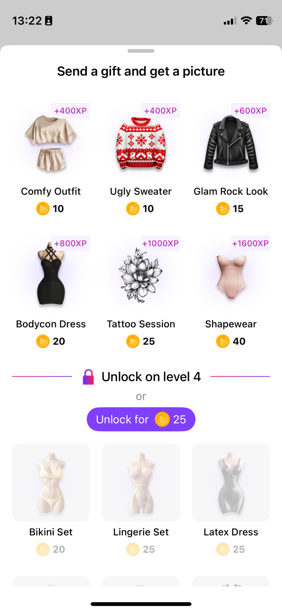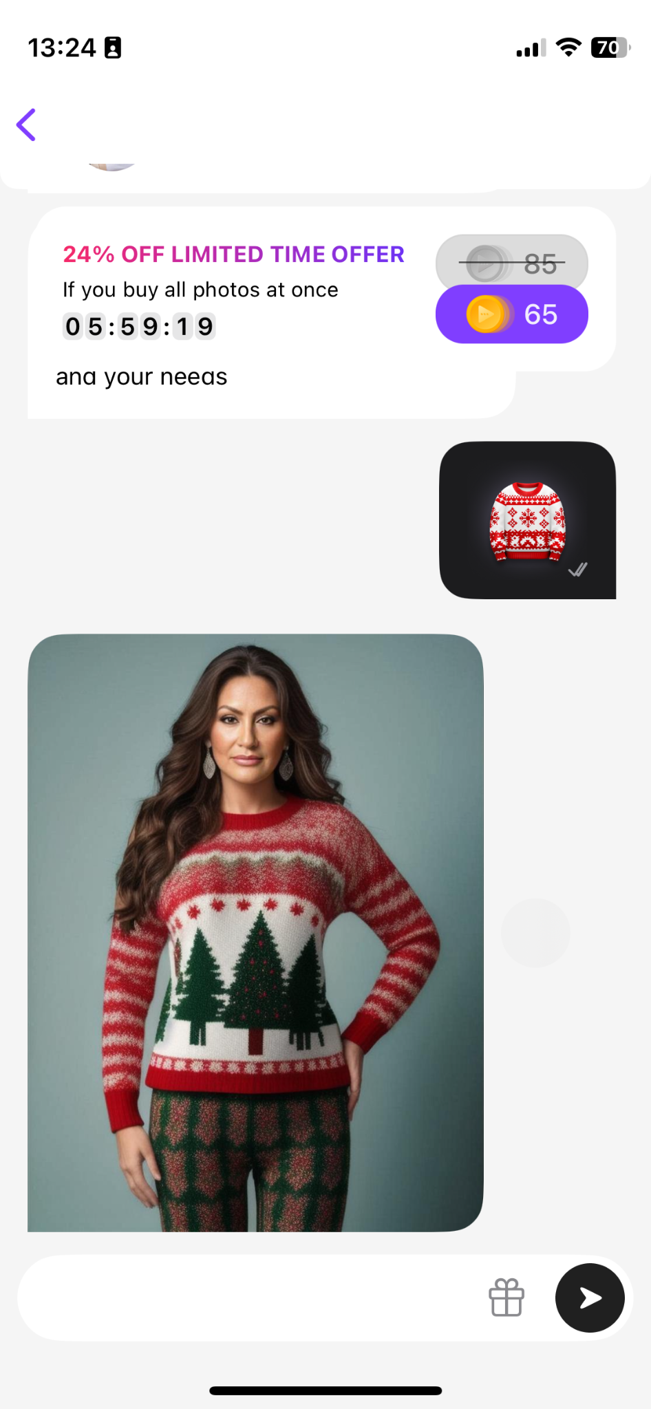 Asking for a picture can sometimes be seamlessly brought into the conversation by the AI GFs themselves, but this is no guarantee that the text-to-image relationship will make sense. On Dialogue, Saul talked to Lucy with the “dating coach” option activated. Soon enough, the gift option popped up, but the items (such as a lingerie set) rather clashed with the context. Committed to keeping up with the coaching setup, Saul decided to offer Lucy an “ugly sweater,” a move which prompted her to send a selfie of herself sporting the garment. While this was visually consistent, there was a heavy “so what?” aftertaste to it.