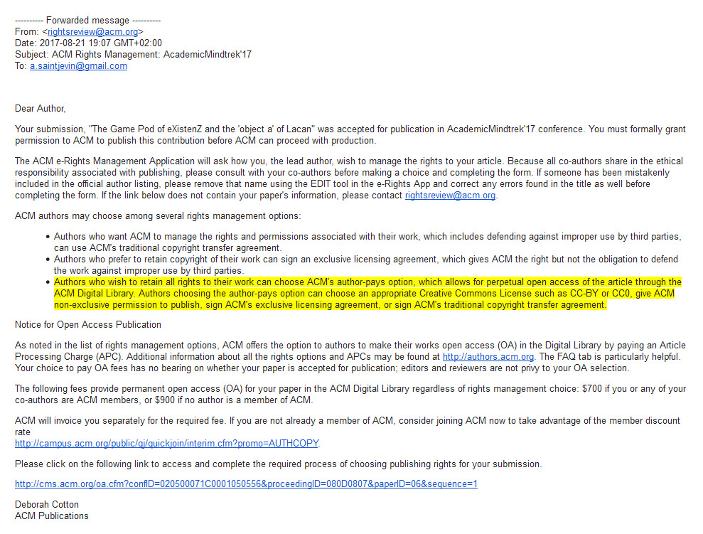 Taylor & Francis publishers, extrait d’un contrat d’édition. Le coût pour « libérer » l’article après publication est d’environ 2150€ (et de 1700€ pour ACM), ce qui dénote clairement un refus de l’open access.