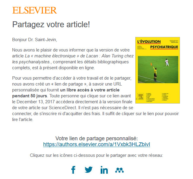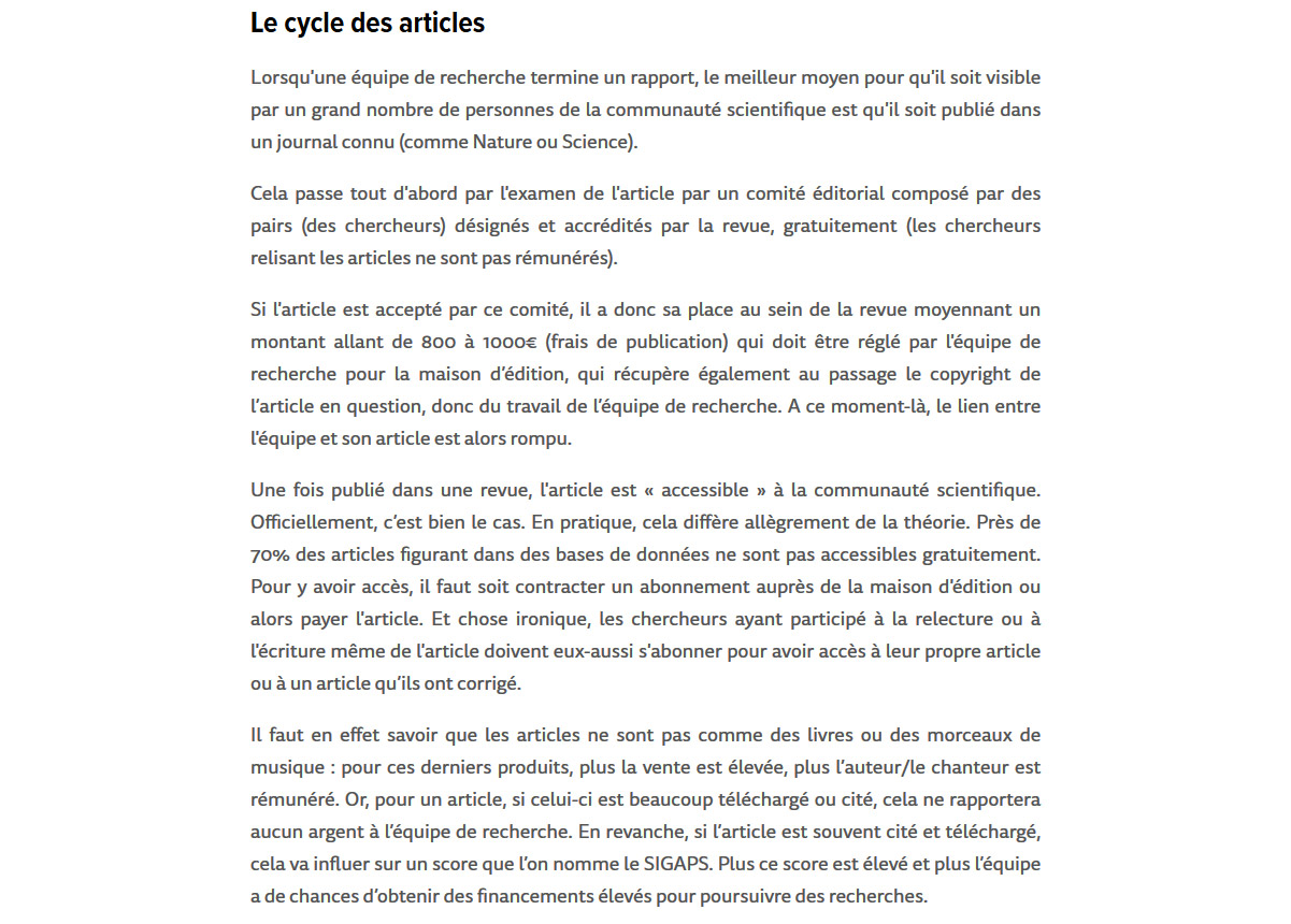 « Lorsqu’un écrit scientifique issu d’une activité de recherche financée au moins pour moitié par [fonds publics] est publié dans [une revue], son auteur dispose […] du droit de le mettre à disposition gratuitement dans un format ouvert, par voie numérique […]. Ce délai est au maximum de six mois pour une publication dans le domaine des sciences, de la technique et de la médecine et de douze mois dans celui des sciences humaines et sociales. »