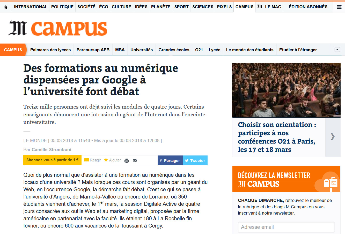 Olivier Ertzscheid, « Facebook forme les chômeurs, Google forme les étudiants. Et les universités vous emmerdent », février 2018