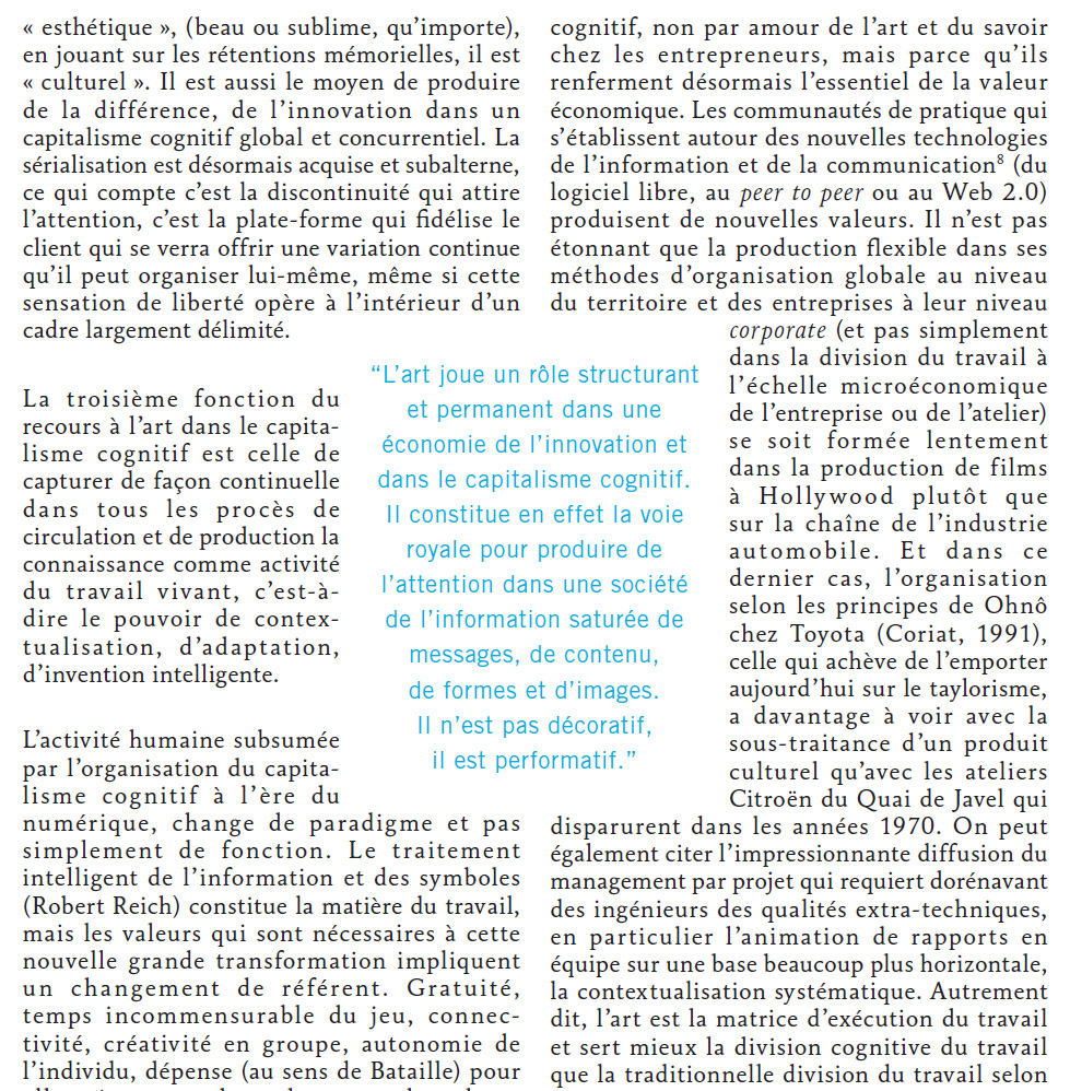 « Ce qui caractérise donc le capitalisme cognitif, ce n’est donc pas qu’il repose sur les connaissance et encore moins sur le secteur limité qui produit des connaissances (les départements R&D des grandes entreprises ou les investissements en machines employées dans ce secteur). Il conquiert ses titres de noblesse et son rang dans la prospection, dans la valorisation et dans l’exploitation des éléments des connaissances qui résistent à la codification numérique […]. Nous avons nommé cette particularité l’exploitation de la force inventive du travail vivant. »