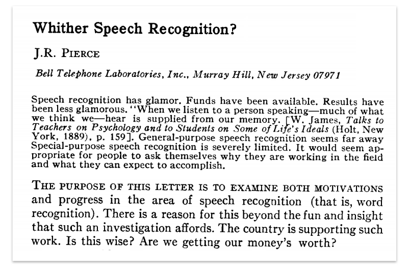 « Nous pensions que c’était mal de demander à une machine d’imiter les gens. Après tout, si une machine doit se déplacer, elle le fait avec des roues, pas en marchant. Si une machine doit voler, elle le fait comme un avion, pas en battant des ailes. Plutôt que d’étudier de manière exhaustive comment les gens écoutent et comprennent la parole, nous voulions trouver la façon naturelle [natural way] de le faire faire par la machine. »
