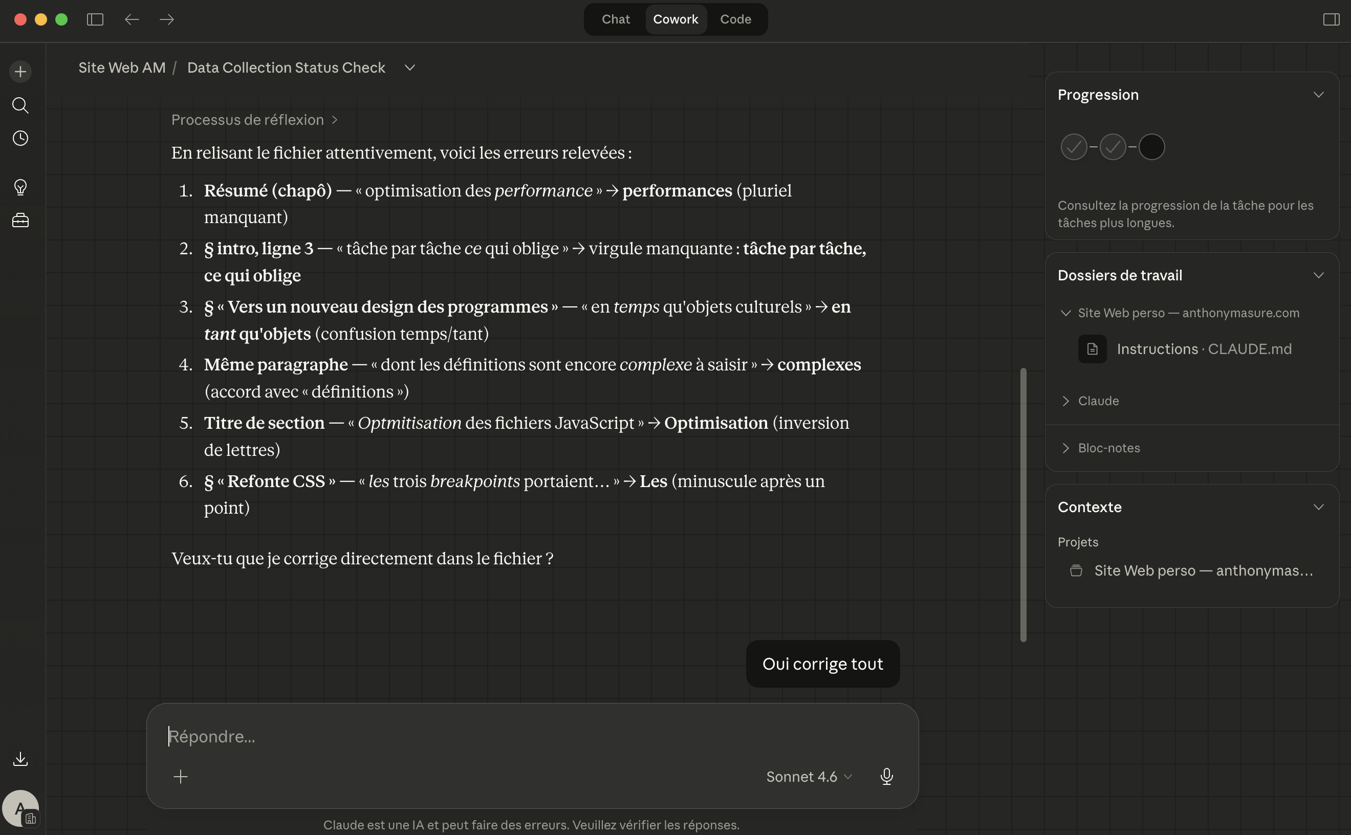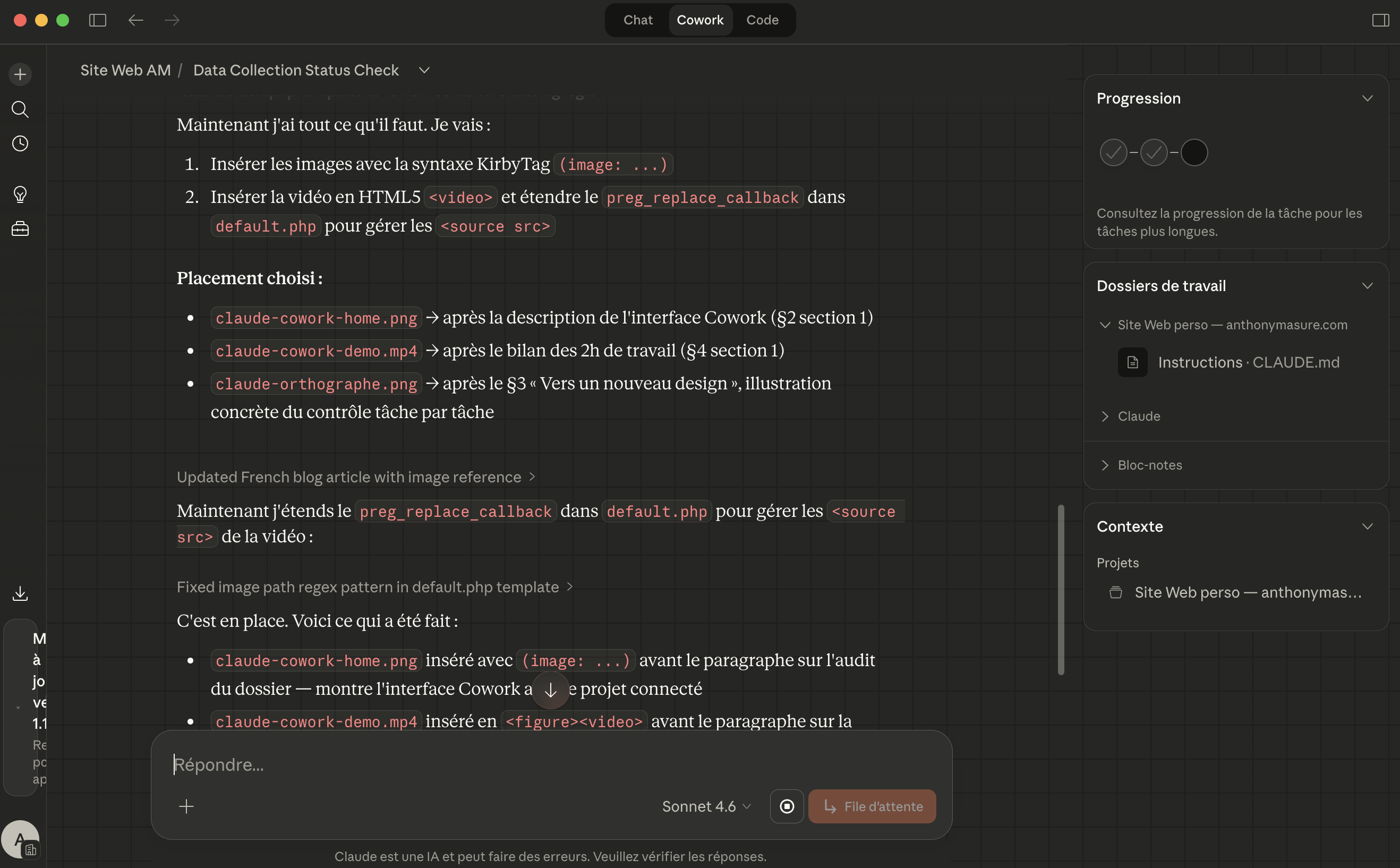 Dans mon cas, l’opération a consisté à pointer Cowork vers le dossier de mon site Web sous Kirby, en local sur ma machine (avec bien sûr une sauvegarde préalable), puis à le laisser auditer l’ensemble des templates, snippets, contrôleurs et autres assets. L’objectif était que Claude repère lui-même les bugs, API dépréciées, incohérences et opportunités d’optimisation, le tout avant d’appliquer les corrections fichier par fichier, sous mon contrôle à chaque étape. Les modifications techniques du site pouvaient être prévisualisées avant déploiement par l’usage d’un serveur local PHP via le logiciel MAMP, dont j’ai l’habitude de me servir.