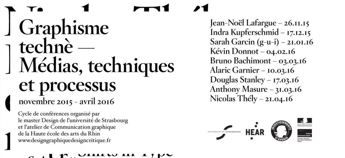 Cycle de conférences organisé par l’université de Strasbourg (Master Design) et la Haute école des arts du Rhin (Atelier de Communication graphique), novembre 2015 — avril 2016.