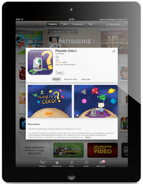 Un jeu vidéo iOS où l’enfant explore des planètes aux thématiques existentielles.