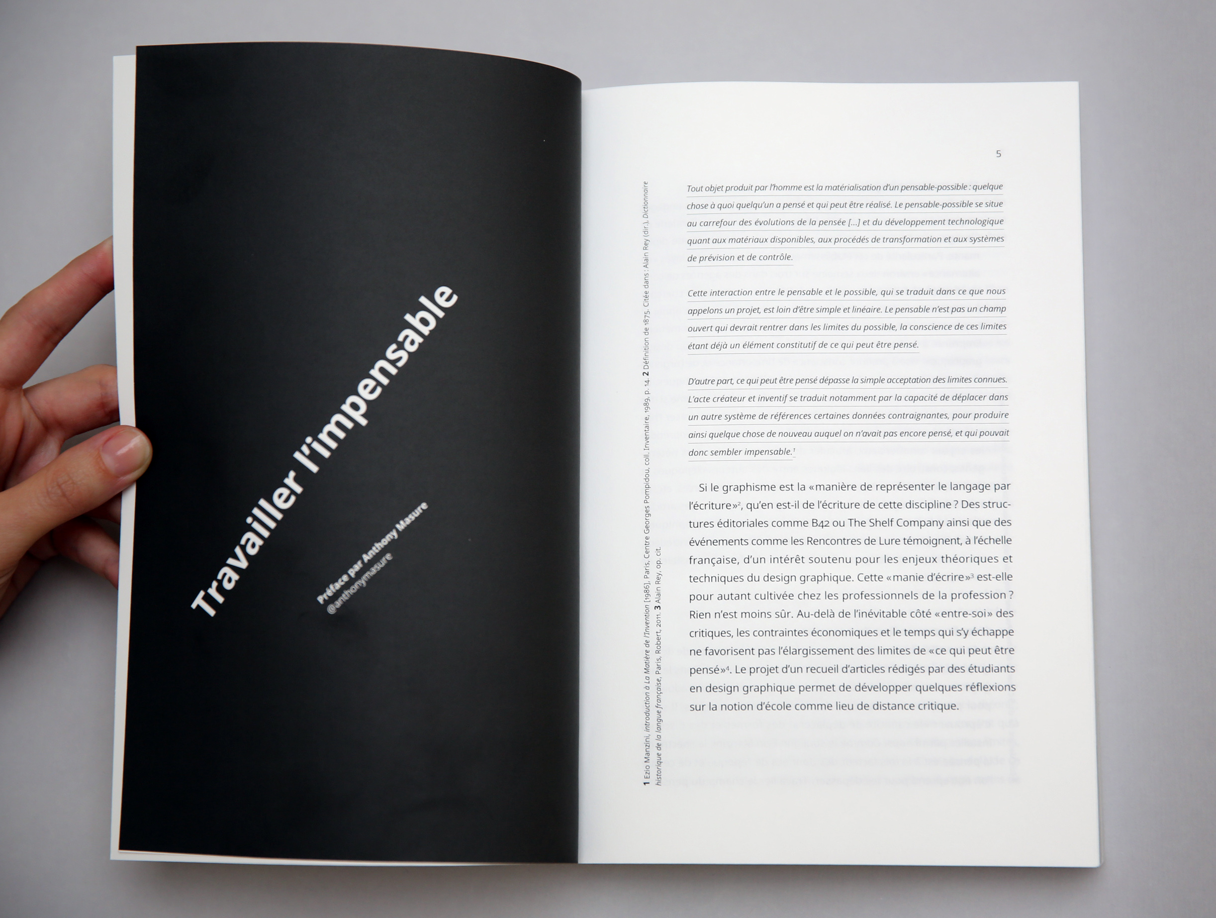 Si le graphisme est la « manière de représenter le langage par l’écriture 2 Définition de 1875. Citée dans : Alain Rey (dir.), Dictionnaire historique de la langue française, Paris, Robert, 2011. », qu’en est-il de l’écriture de cette discipline ? Des structures éditoriales comme B423 http://www.editions-b42.com, Ypsilon4 http://ypsilonediteur.com ou The Shelf Company5 http://www.theshelf.fr, des initiatives comme Graphisme en France6 http://www.cnap.graphismeenfrance.fr ou des évènements comme Les Rencontres de Lure7 http://delure.org témoignent, à l’échelle française, d’un intérêt soutenu pour les enjeux théoriques et techniques du design graphique. Cette « manie d’écrire 8 Alain Rey, op. cit. » est-elle pour autant cultivée chez les professionnels de la profession ? Rien n’est moins sûr. Au-delà de l’inévitable côté « entre-soi » des critiques, les contraintes économiques et le temps qui s’y échappe ne favorisent pas l’élargissement des limites de « ce qui peut être pensé 9 Ezio Manzini, op. cit. ». Le projet d’un recueil d’articles rédigés par des étudiants en design graphique permet de développer quelques réflexions sur la notion d’école comme lieu de distance critique.