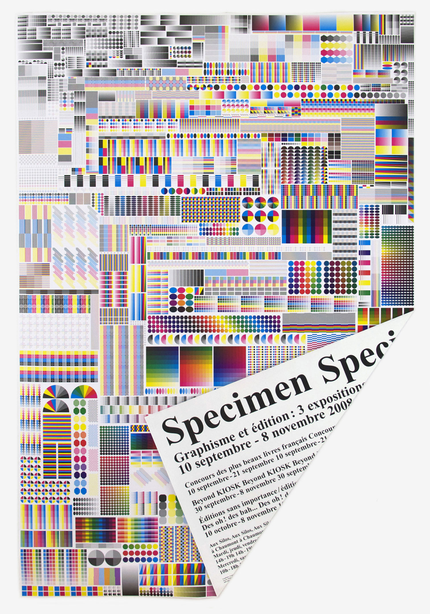 Au-delà de ces promesses, un champ de recherche pour les designers graphiques consisterait à faire apparaître les systèmes techniques qui disparaissent habituellement derrière des interfaces «transparentes». Il ne s’agit donc plus simplement d’organiser le monde, mais avant tout de donner à le comprendre 30 «(Notre époque) se raidit pour atteindre l’absolu et l’empire, elle veut transfigurer le monde avant de l’avoir épuisé, l’ordonner avant de l’avoir compris.» Albert Camus, «L’Exil d’Hélène», dans: L’Été, Essais, Paris, La Pléiade, 1963, p. 856.. Dans les projets de design qui nous intéressent, la technique n’est pas abordée dans sa dimension fabuleuse, mais révélée dans sa puissance de nouveauté. Il en est ainsi de l’affiche Specimen de Fanette Mellier, réalisée dans le cadre d’une exposition au pôle graphique de Chaumont en 2009. Ce projet ne cherche pas à «faire image», mais affirme son statut d’objet imprimé, appréciable à une échelle déterminée. Le recto est rempli des trames et gammes colorées servant au calibrage des machines d’impression. Ce motif obsessionnel sature la page d’éléments géométriques non symboliques, faisant de ce qui n’est habituellement pas vu l’endroit d’une expérience sensible. Le verso de l’affiche contient des éléments informatifs conventionnels. Une fois pliée, l’affiche joue du contraste entre ces deux modes d’approche du design graphique: manifester une technique ou délivrer un message.