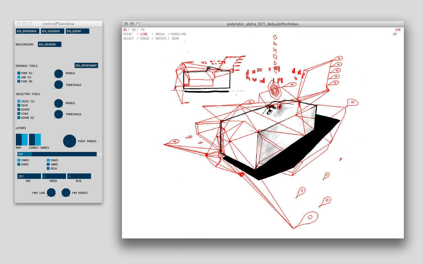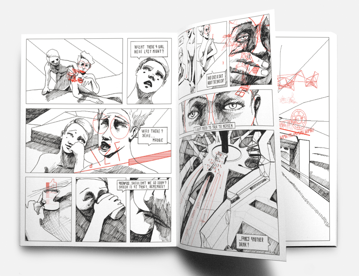 Les logiciels sont généralement plus intéressants quand ils sont employés pour des usages qui n’étaient pas prévus initialement. Utilisé dans le projet Murmur, Processing permet aux designers d’inventer de nouveaux environnements de travail. À la recherche d’une esthétique pertinente pour leur «journal de recherche», les designers de NORMALS ont développé dans Processing une interface de création de bande dessinée vectorielle. La forme est directement issue du code, et non d’une logique analogique. Une fonction de leur programme Polyrotor connecte ainsi les nouveaux points placés sur l’écran à ceux qui sont les plus proches 47 «Delineating the Future – an interview with NORMALS», Creative Applications Network, 6 décembre 2013, (En ligne), creativeapplications.net/theory/delineating-the-future-an-interview-with-n-o-r-m-a-l-s. Cette façon de faire du graphisme en numérique invente des formes qui ne sont pas totalement anticipables par l’imagination. Les formes polygonales dessinent un futur où le réalisme de l’image est mis en doute au profit d’hypothèses et de fictions transversales. Sans même connaître les processus de création, le lecteur comprend qu’il a affaire à un dialogue stéréoscopique entre l’homme et la machine.