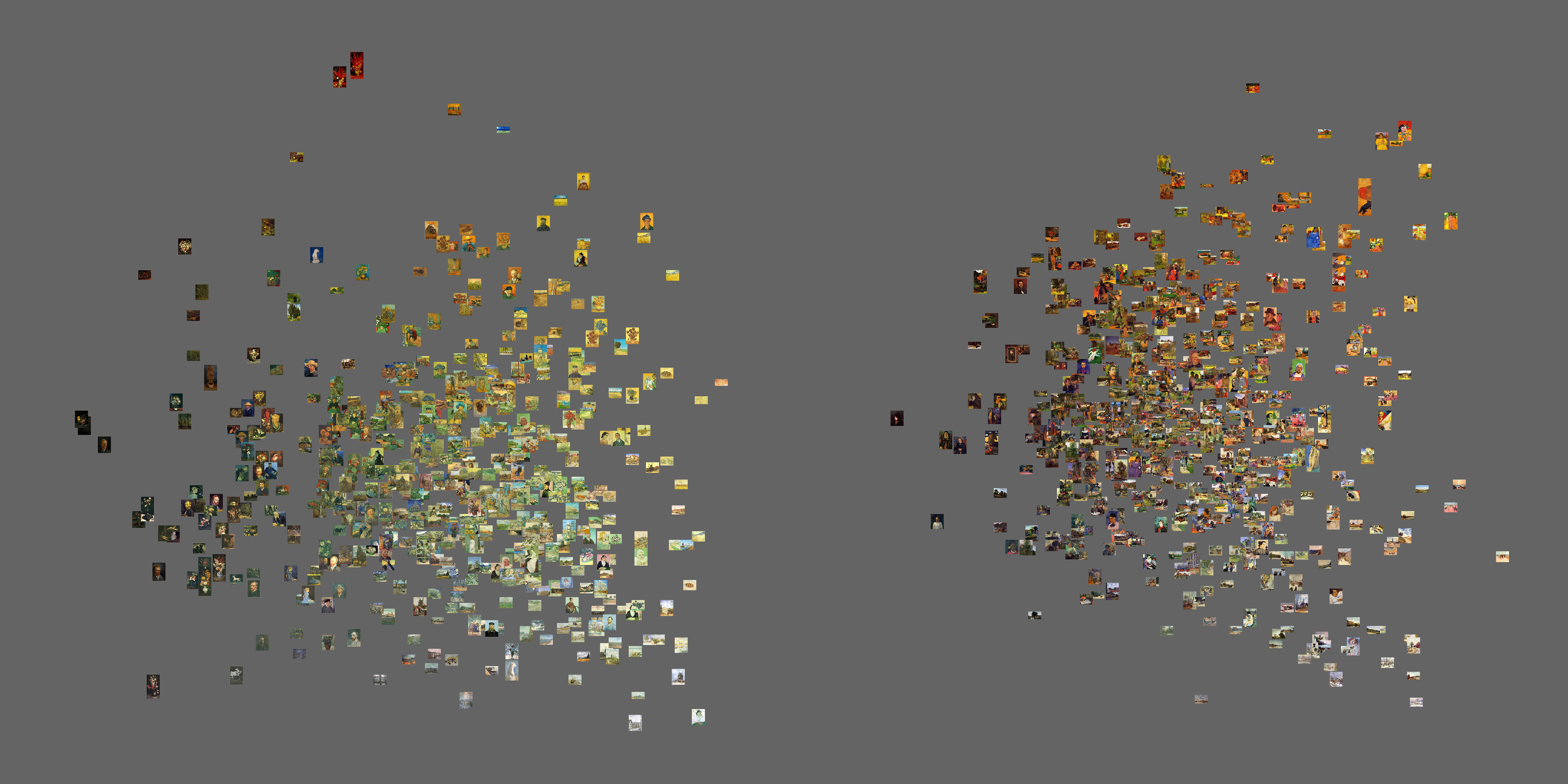 Il s’agit ici de visualiser les productions d’un artiste ou d’un groupe de créateurs à une échelle beaucoup plus large que celle des outils d’analyse « traditionnels », qui se limitent généralement à l’interprétation d’un petit nombre de documents. Cette approche complémentaire permet de dégager, grâce à des regroupements dynamiques résultant de la répartition spatiale des images, d’autres connaissances qui sont propres à l’époque du numérique. L’intérêt que porte Manovich à l’histoire de l’art se retrouve ainsi dans les corpus de ses activités de recherche, avec des analyses à grande échelle d’artistes tels que Van Gogh, Mondrian ou Rothko.