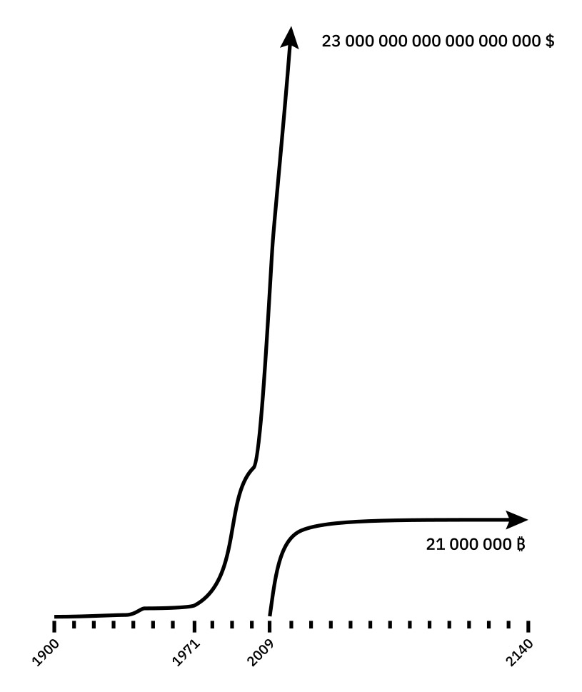 Les accords de Nixon en 1971 ont été suivis d’une hyper inflation du dollar (émission multipliée par 57 entre 1970 et 2018). A contrario de ce développement exponentiel, l’émission des bitcoins suit une courbe logarithmique pour atteindre le nombre maximal de 21 millions de bitcoins émis.