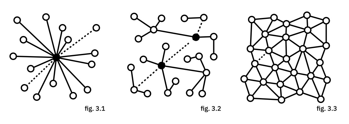 Centralisé [Fig. 3.1] (ex. : Paypal, Western Union), polarisé [Fig. 3.2] (système bancaire actuel), distribué [Fig. 3.3] (Bitcoin). On remarquera que seul ce dernier ne fait pas appel à un tiers de confiance (points noirs) pour fonctionner.
