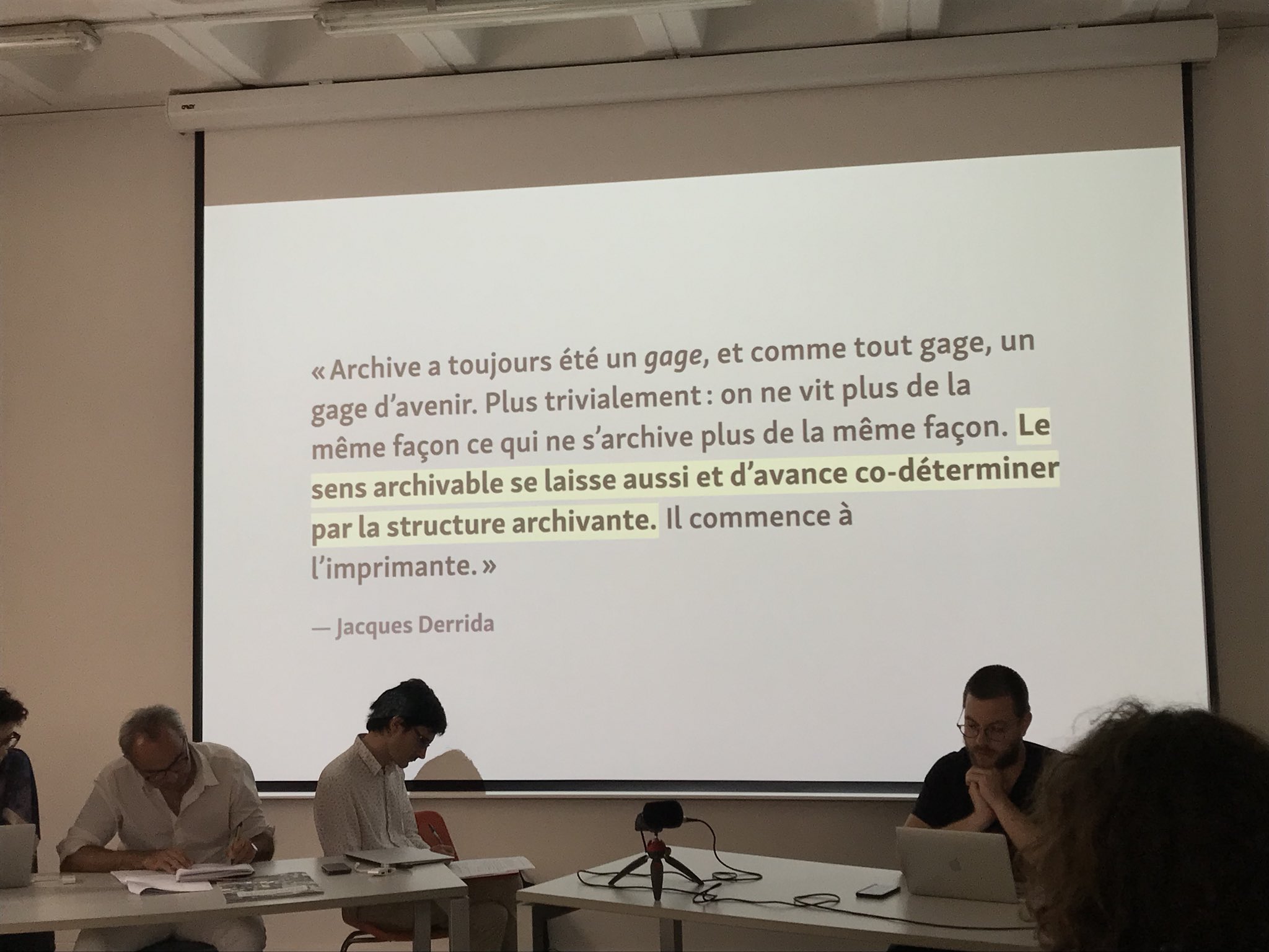 Dans son essai Mal d’archive (1995), le philosophe Jacques Derrida mettait en exergue le paradoxe de toute archive : d’un côté la volonté de mettre des marques à l’abri de l’effacement du temps et de l’oubli, et de l’autre côté le fait que ces éléments, une fois stockés, sont dès lors disponible à la reproduction et menacent donc l’idée de stabilité. Cette notion d’archive « vivante », mobile, nous semble d’autant plus prégnante lorsque se pose la question de l’aspect de sa structure et de son fonds, car tout travail de design graphique engage un déplacement quand à l’original. Face à la permanence et au pouvoir de l’arkhè, le design est donc toujours un risque, un « gage d’avenir » (Derrida) et de nouveaux commencements.